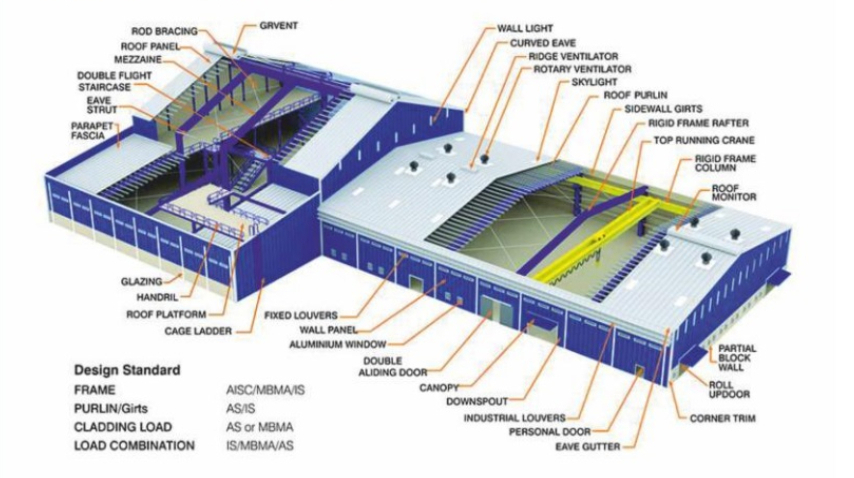 Uses tapered beam section concept, thus ensuring right amount of structural steel at right place. Built up sections are made from HR plats with submerged arc welding process in automatic welding machine in the factory. Uses cold formed either galvanized or non galvanized section for secondary members. Usage of metal colour coated material for sheets and cladding which are durable and aesthetically good looking. Column free building with longer spans, building with mezzanine, cranes with different functional requirement.